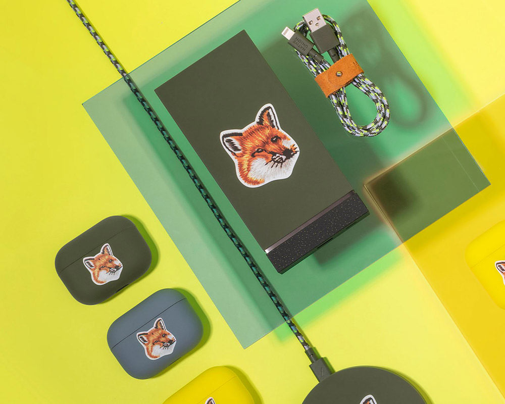This collection features everyday tech essentials revisited in a playful way with bright colors and the Fox Head logo from Maison Kitsuné.